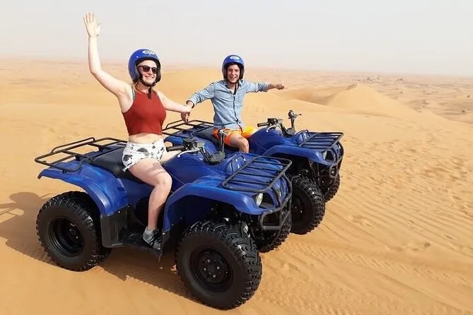 Partez à l’aventure sur votre quad dans les dunes rouges de Lehbab à Dubaï, testez le sandboard (préparez-vous à en avoir plein les chaussures), dégustez café arabe et douceurs dans un camp bédouin, puis profitez d’une balade à dos de chameau sous un ciel désertique immense. Transfert hôtel inclus et guide local pour une expérience inoubliable.