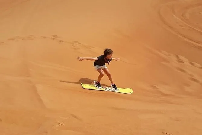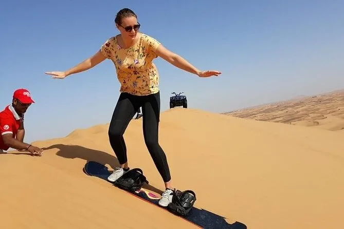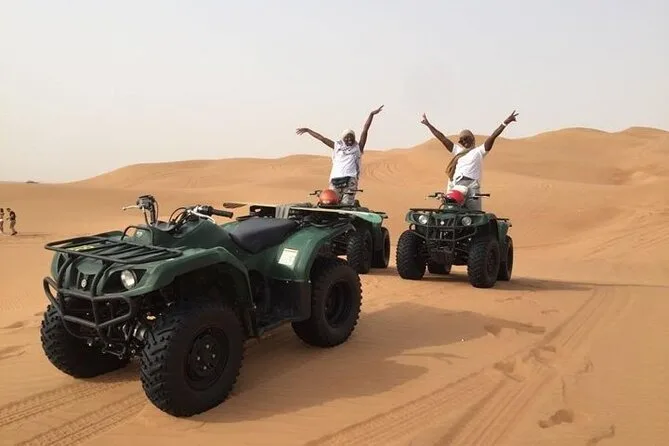 Votre journée comprend la prise en charge et le retour à l’hôtel en véhicule climatisé, une heure de quad en autonomie sur les dunes rouges de Lehbab avec l’aide de guides expérimentés, une séance de sandboard sur des pentes soyeuses, l’accès à un camp bédouin où vous dégusterez boissons fraîches, café ou thé arabe, dattes et douceurs lukaymat. Vous profiterez aussi d’une balade à dos de chameau avant le retour — et en hiver, vous pourrez même poser avec un faucon.