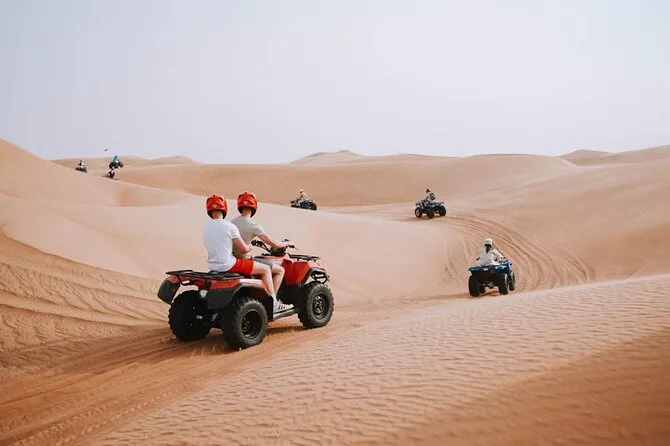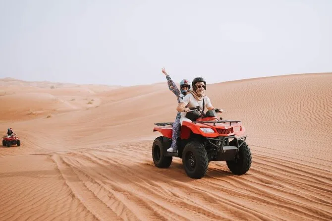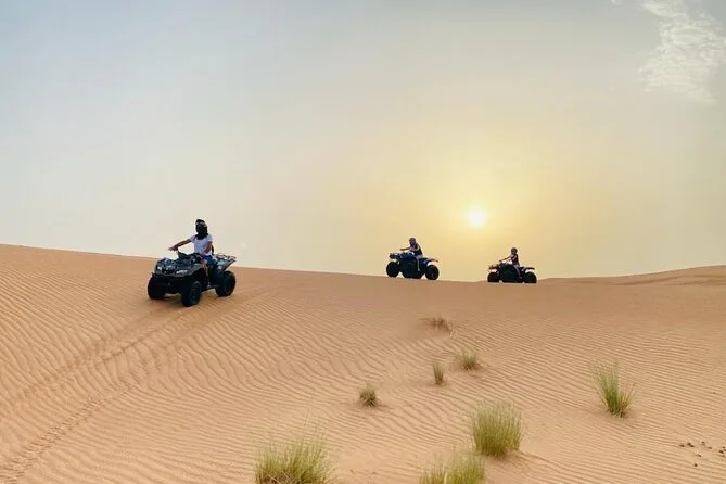 Votre journée comprend la prise en charge et le retour à l’hôtel en véhicule climatisé, depuis n’importe quel endroit à Dubaï. Tout l’équipement pour le quad est fourni — casques et lunettes inclus — ainsi qu’un temps dédié au sandboard sur les dunes. Une balade à dos de chameau au coucher du soleil (avec plein d’occasions de photos), des boissons fraîches à volonté, du café arabe servi au camp, et la possibilité de prendre une photo avec l’oiseau national des Émirats. Tous les frais et taxes sont inclus — il ne vous reste plus qu’à venir prêt pour l’aventure !