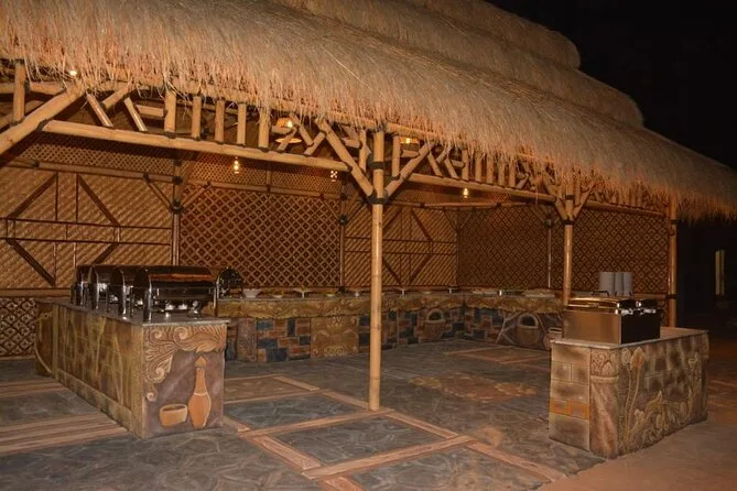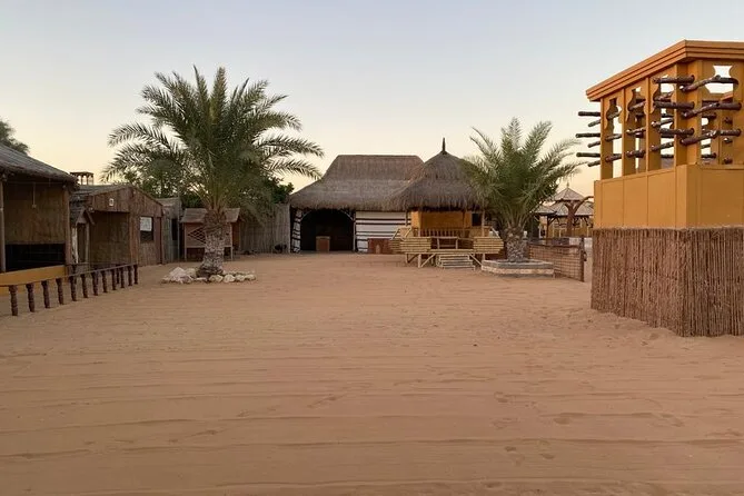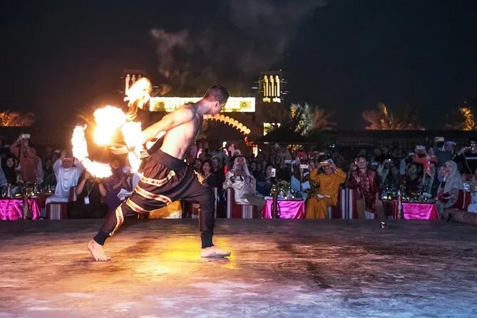 Votre soirée comprend un transport privé avec prise en charge et retour en véhicule climatisé, de l’eau en bouteille, des entrées suivies d’un dîner sous la lumière des lanternes, une balade à dos de chameau dans les dunes, du sandboard si vous le souhaitez, ainsi que des spectacles vivants comme la danse tanoora, la danse du ventre et un spectacle de feu avant de retourner à Dubaï.