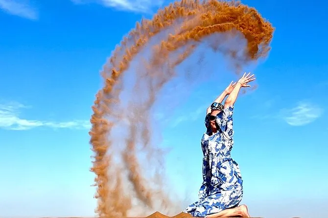 Vous vivrez une balade à dos de chameau, du sandboard, un spectacle de tanoora, de la danse du ventre, un spectacle de feu, et un dîner.