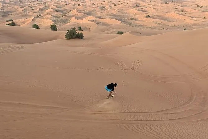 Votre soirée comprend la prise en charge et le retour au Dubai Mall en véhicule climatisé avec un guide local qui vous emmène faire du dune bashing sur les hautes dunes rouges de la région de Lehbab. Vous testerez le sandboard et profiterez d’une courte balade à dos de chameau pour les photos avant de rejoindre un camp bédouin où vous savourerez des snacks, boissons à volonté, spectacles en live (danse orientale, feu, danse Tanura), chicha, tatouage au henné (pour les dames), photos avec un faucon, et un dîner buffet BBQ avec options végétariennes et non végétariennes, avant de retourner à votre point de départ.