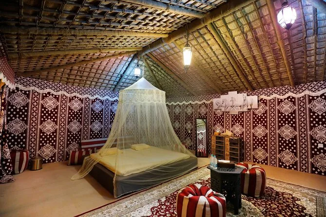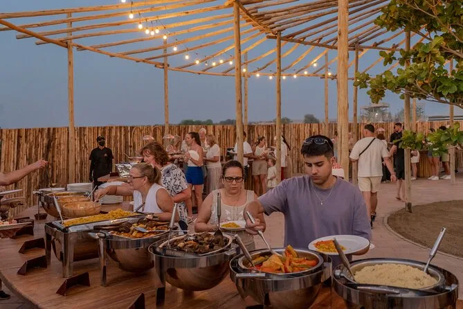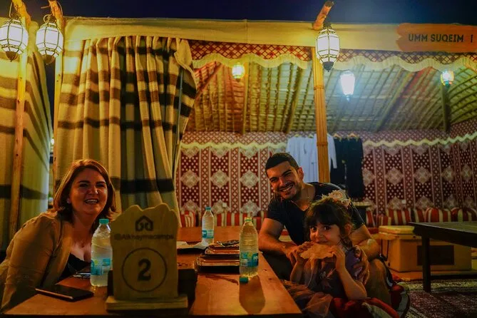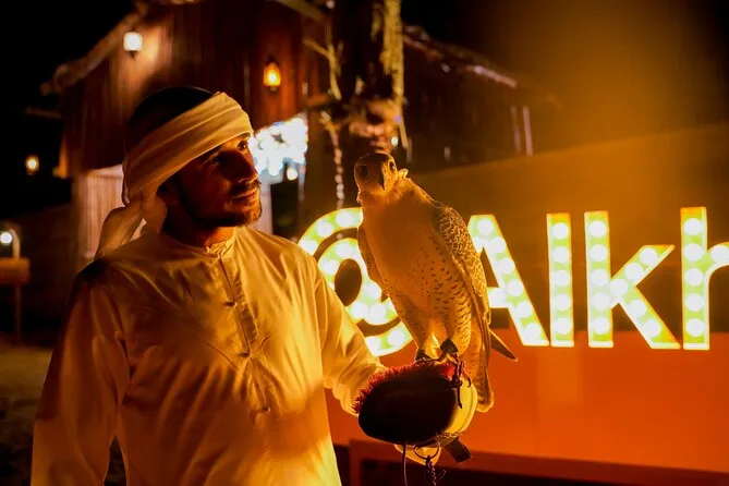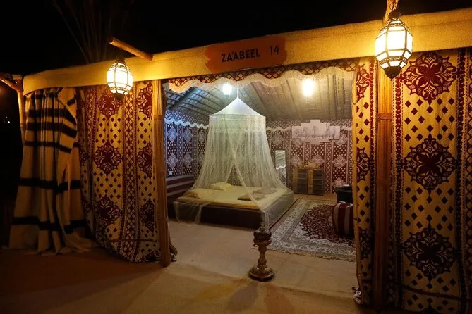 Votre safari dans le désert avec nuit inclut le transfert depuis votre hôtel en 4x4 confortable, toutes les activités de dune bashing et sandboard avec guide agréé, de courtes balades à dos de chameau (y compris la balade au lever du soleil), l’utilisation de la pipe à shisha, le tatouage au henné pour les dames, des photos avec un faucon, de l’eau et des boissons non alcoolisées à volonté ainsi que du thé et des douceurs arabes à l’arrivée. Vous profiterez d’un dîner barbecue buffet avec spectacles avant de dormir dans votre tente privée climatisée au camp Al Khayma — puis vous vous réveillerez avec un petit-déjeuner avant de retourner en ville à Dubaï.