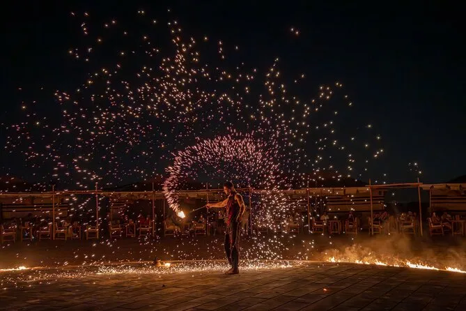 Le dîner a largement dépassé mes attentes — viandes grillées, salades aux graines de grenade, pain encore chaud cuit au feu. Des danseuses tournaient si vite que leurs jupes devenaient floues ; quelqu’un a installé un télescope pour observer les étoiles quand les lumières se sont éteintes. La nuit est vite devenue fraîche — pensez à prendre une couche supplémentaire si vous êtes comme moi et que vous avez froid. Assis près du feu, Ahmed racontait des histoires de son enfance à Sharjah, un moment à la fois nouveau et étrangement familier, comme camper partout sauf pour ce silence total entre les rires.