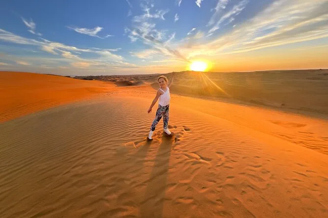 Le dune bashing… disons que mon estomac s’en souvient encore. Quarante minutes à glisser de côté sur les dunes rouges en 4x4, la musique en fond, tout le monde à moitié en rigolant, à moitié en criant. À un moment, la voiture s’est arrêtée au sommet d’une dune, on n’entendait plus que le vent — puis on a replongé. Le sandboard après ça, c’était presque relaxant en comparaison. On s’est arrêtés pour le coucher de soleil ; j’ai essayé de prendre une photo mais j’ai surtout regardé le ciel s’embraser derrière les dunes. Certains ont posé avec un faucon (j’ai passé mon tour — les oiseaux me rendent nerveux), mais j’ai essayé une robe arabe pour la photo. Ça m’allait mieux que prévu.