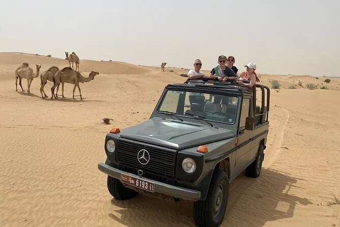 Votre visite comprend la prise en charge et le retour à votre hôtel, une balade guidée en Mercedes G-Class vintage à travers l’oasis d’Al Marmoom, des opportunités d’observation d’animaux, la visite d’un village bédouin authentique avec accueil traditionnel, une courte balade en caravane de chameaux et un petit-déjeuner préparé sur place dans le désert. Des sièges bébé spécialisés sont disponibles sur demande.