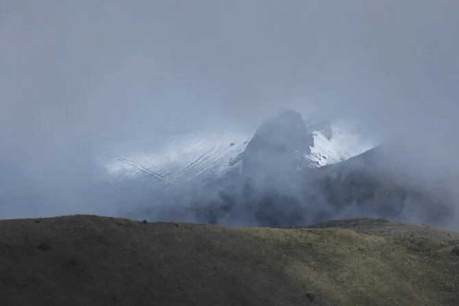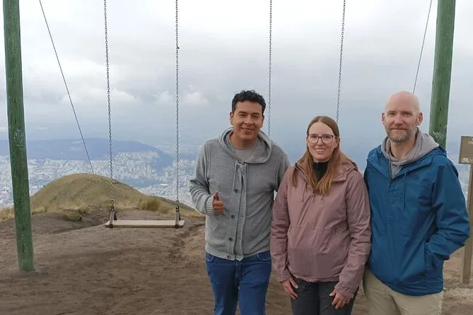 Ensuite, retour vers la ville pour prendre le téléphérique de Quito. Le câble grinçait doucement tandis que nous montions au-dessus des toits. Au sommet, les nuages étaient si proches qu’on aurait presque pu les toucher — parfois ils engloutissaient la vue en un instant, puis soudain le Cotopaxi apparaissait au loin, tout enneigé et silencieux. Il faisait vite frais ; mes mains sont devenues engourdies en tenant cette balançoire (celle que tout le monde photographie). Andrés nous a montré les volcans un par un, mais j’ai vite oublié la moitié, sauf le Pichincha, qu’il a surnommé « le vieux grincheux qui veille sur Quito ».