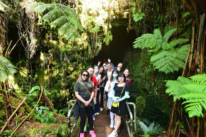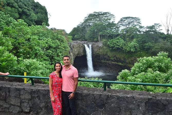 La visite dure toute la journée avec plusieurs arrêts, notamment la plage de sable noir de Punaluʻu, Rainbow Falls et le parc national des volcans d’Hawaï avant le retour.
