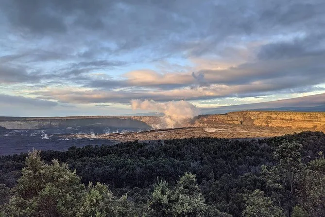 Votre journée comprend le transfert depuis votre hôtel à Kona ou Waikoloa, l’entrée au parc national des volcans d’Hawaï avec visite guidée le long de la Chain of Craters Road, un accès exclusif et dégustation dans une ferme de café Kona 100 % (avec beaucoup d’échantillons), des snacks et boissons en route — y compris de l’eau — et un déjeuner avec vue sur la caldeira du Kilauea avant le retour par la Saddle Road avec arrêts photo ou courtes balades selon la météo.