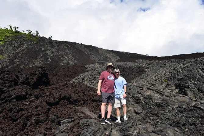 La visite dure toute la journée avec des arrêts à une ferme de café Kona, la plage de sable noir de Punaluʻu, le parc national des volcans, les Rainbow Falls près de Hilo, et le retour par la Saddle Road.