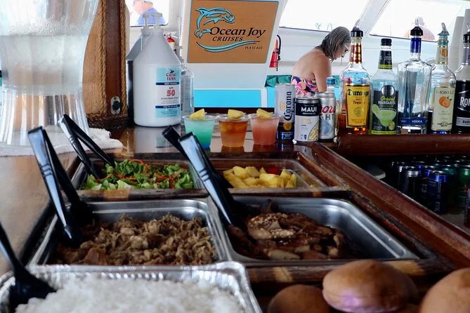 Le buffet a un goût spécial après la baignade — porc kalua et poulet teriyaki servis avec du riz et de l’ananas, bien plus sucré que chez nous. Quatre boissons incluses (je me suis arrêté à deux mai tais parce que… ben, faut garder l’équilibre sur le bateau). Sur le chemin du retour, tout le monde était plus calme ; peut-être rassasié ou simplement en train de savourer l’instant. Parfois, il y a ces petits moments où Hawaii semble à la fois familier et totalement nouveau. Je repense encore à ces dauphins.