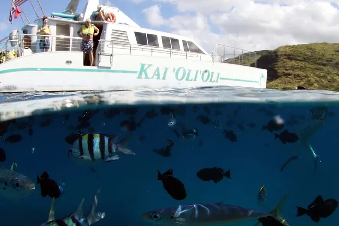 Embarquez à bord d’un catamaran confortable le long de la côte sauvage de Waianae à Oahu, guidé par des locaux qui connaissent vraiment ces eaux. Observez les dauphins jouer à proximité, faites du snorkeling au-dessus de récifs colorés avec tortues et poissons tropicaux, puis profitez d’une douche chaude avant de savourer un buffet hawaïen avec boissons en naviguant vers la côte. Une expérience détendue et presque magique — surtout quand viennent ces instants de calme entre deux moments d’émerveillement.