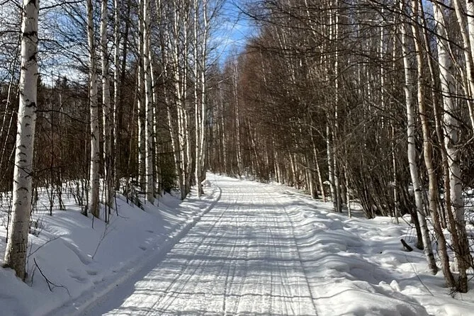 Les premières minutes furent un mélange de vrombissements et de flou blanc, puis nous sommes arrivés dans une clairière où les arbres s’écartaient pour laisser place à une vaste étendue scintillante — les lacs Chena, complètement gelés. Je ne m’attendais pas à me sentir si petit là-bas. Le soleil rebondissait sur la glace, c’était presque aveuglant. Seuls nos moteurs brisaient le silence, parfois un corbeau passait au-dessus. Eli montra des traces d’orignaux au bord du lac. À un moment, il arrêta tout pour qu’on profite du silence — juste ça, et un rire étouffé derrière moi.