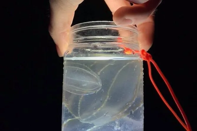 Il faisait plus frais que prévu pour la Floride, mais c’est justement à ce moment-là que les méduses bioluminescentes apparaissent (apparemment, elles sont assez sélectives sur les saisons). Jamie nous a expliqué que ces petites créatures viennent des eaux plus profondes chaque hiver — elle nous a même laissé en tenir une doucement dans la main. C’était comme tenir une bille vivante, fraîche et glissante, qui pulsait d’une lumière bleu-vert étrange quand on bougeait les doigts. À un moment, elle a braqué sa lampe torche juste comme il faut et les cils sur les côtés ont scintillé en arc-en-ciel — franchement hypnotisant.