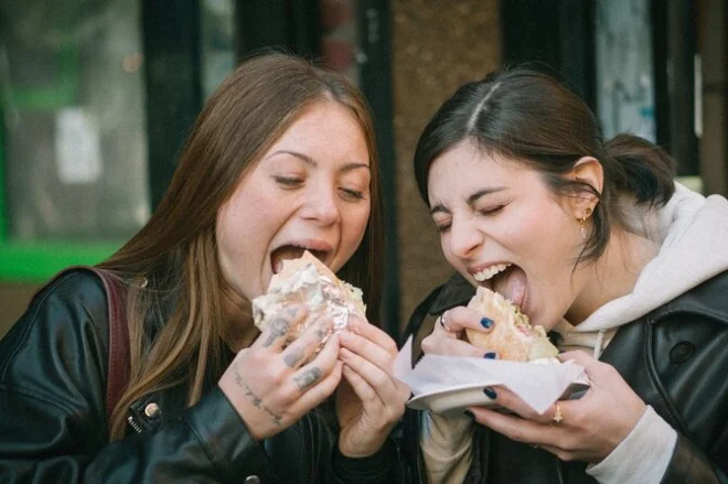 Côté nourriture, impossible de choisir un arrêt préféré. La part de pizza aux artichauts était tellement épaisse et crémeuse qu’on aurait dit une lasagne sur du pain (je sais, ça paraît bizarre, mais croyez-moi). Chez Faicco’s, on a goûté des petites boules de riz et de la sopressata — salé, fondant, parfait avec une gorgée d’eau, sinon on mâche sans fin. Ah ! Et chez Pommes Frites, il y avait plus de sauces que je ne savais qu’il en existait ; Li m’a défié d’essayer la mayo à l’ananas vietnamienne qui… étonnamment, ça marchait bien ! La bière était bien fraîche aussi, pour ceux qui voulaient. On a fini dans une boutique de cupcakes qui ressemblait à une cantine d’école dans un vieux film — des balançoires à la place des chaises, des boîtes à lunch partout. Mon cupcake avait beaucoup trop de glaçage, mais j’ai quand même tout mangé.