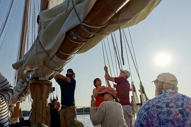 Je n’arrêtais pas de penser à quel point c’était différent d’être sur un vieux schooner plutôt que sur un de ces gros bateaux de fête — il y avait de la place pour bouger sans jamais se sentir à l’étroit. Le bois sous les pieds était usé et doux, et de temps en temps, une petite éclaboussure de mer venait caresser le visage si on se penchait trop (ce que j’ai fait, bien sûr). Un membre de l’équipage nous a raconté les voyages d’Appledore autour du monde ; apparemment, elle a fait plusieurs fois le tour de la planète. Ça m’a marqué — ça donnait une autre dimension à cette simple croisière de deux heures au coucher du soleil.