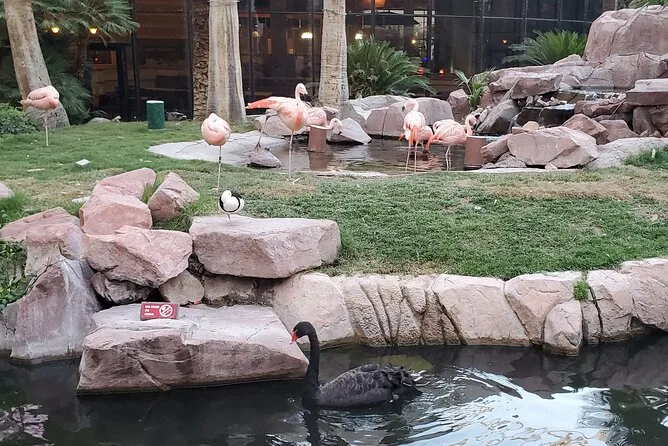 Au Grand Bazaar Shops, un mélange de parfums d’intérieur et de fumée de barbecue flottait dans l’air. On a goûté un truc épicé qui m’a fait tousser (Tony a rigolé ; apparemment c’est signe que c’est bon). Puis, tout à coup, on est arrivés au Flamingo Habitat, une pause étonnamment paisible — des flamants roses qui se tenaient là, tranquilles, pendant que les machines à sous bipaient au loin. Je ne m’attendais pas à ressentir ça à Vegas, mais pendant un moment, oui.
