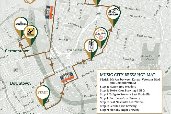 Le circuit comprend six arrêts : Honeytree Meadery, Tailgate East, Southern Grist, East Nashville Beer Works, Bearded Iris Brewing et Monday Night Preservation Society.