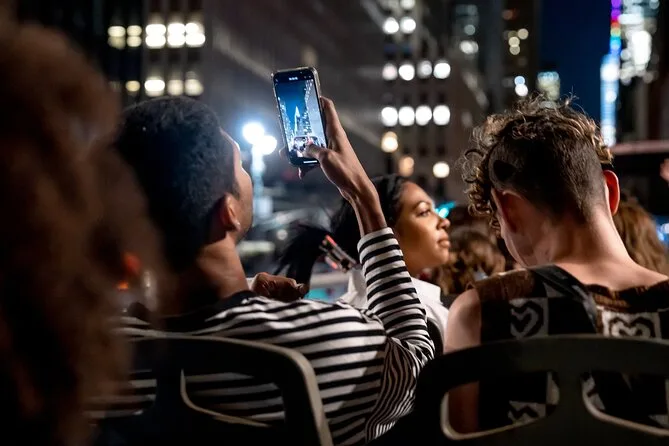 Votre soirée comprend une balade panoramique de 1h30 en bus à toit ouvert à travers les monuments les plus célèbres de New York, avec un audio guide préenregistré disponible en 11 langues et des écouteurs offerts pour profiter pleinement de votre expérience.