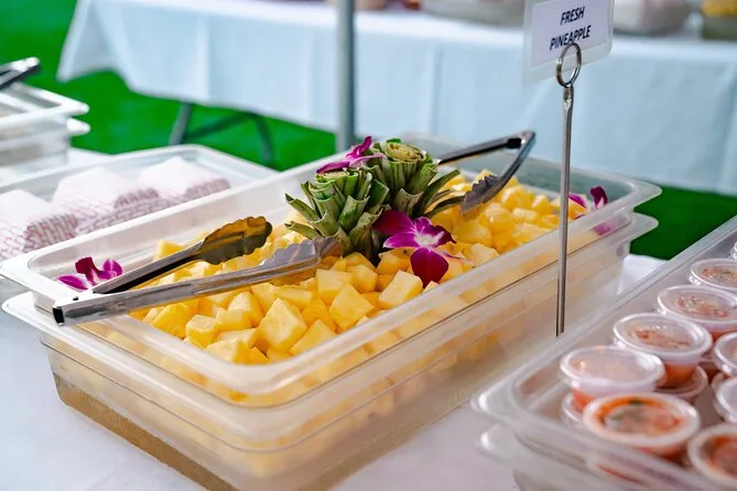 Le tour comprend un buffet polynésien à volonté avec des plats comme le porc kalua et l’ananas grillé ; les boissons sont commandées et servies à table.
