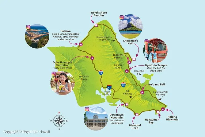 Votre journée comprend la prise en charge en bus deluxe avec toilettes à bord, un petit-déjeuner avec malasada au poi et eau en bouteille, des arrêts aux points de vue comme Diamond Head et Hanauma Bay (sauf le mardi), l’entrée au temple Byodo-In, des dégustations à Tropical Farms Macadamia Nut Farm, la vue sur les plages de la North Shore, une visite de la plantation Dole avant le retour en soirée.
