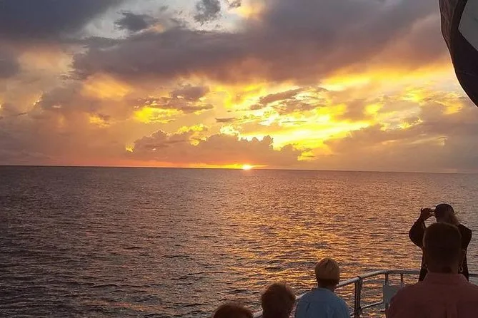 J’ai attrapé un punch au rhum dans la cuisine (ils ne lésinent pas sur la dose) et trouvé une place au bastingage. Le soleil commençait à descendre, baignant tout d’une lumière dorée-orange. Une playlist s’est fait entendre—douce et tranquille, rien de trop fort—et tout le monde s’est détendu. Un homme près de moi essayait d’apprendre à sa fille à repérer les pélicans qui glissaient au-dessus de l’eau ; elle était plus fascinée par son reflet dans ses lunettes de soleil. Il faisait chaud sans être étouffant, avec cette brise qui donne envie de rester dehors toute la nuit. Honnêtement, j’aurais aimé avoir un petit pull pour plus tard, mais une fois lancés, ça ne m’a plus du tout dérangé.