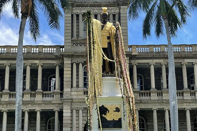 Dernier arrêt en centre-ville : la statue du roi Kamehameha, sa cape dorée brillant au soleil, puis une balade rapide autour du palais Iolani. Des enfants jouaient à chat sous les banians, et des groupes de touristes passaient en parlant plusieurs langues — j’ai essayé de dire « mahalo » comme Kaleo, mais j’ai sûrement massacré le mot. Bref, si vous cherchez une visite de Pearl Harbor au départ d’Honolulu qui couvre tous les grands sites historiques sans être pressée ni trop formatée… celle-ci m’a vraiment plu.