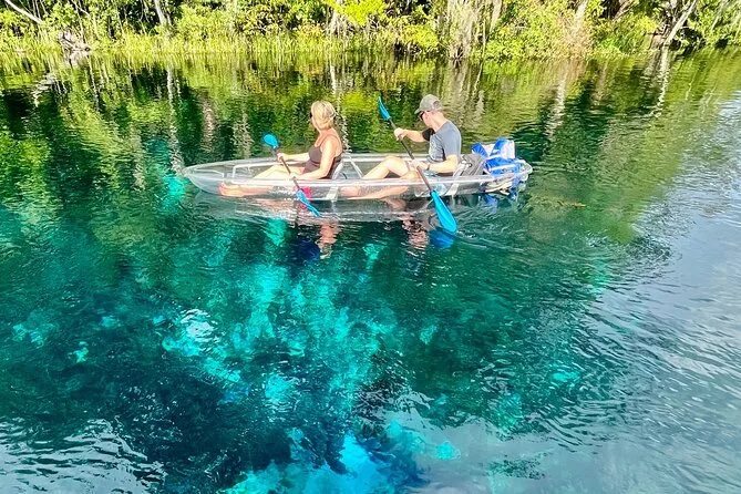 La sortie inclut des kayaks tandem transparents, gilets de sauvetage, pagaies et sacs étanches.