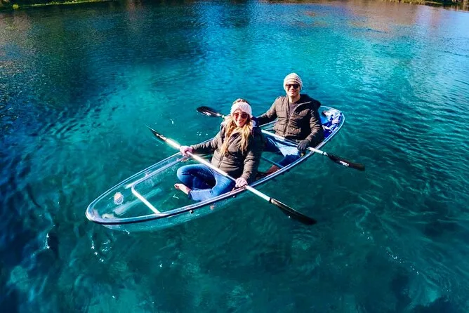 Votre journée comprend l’utilisation de kayaks tandem transparents avec sièges confortables, gilets de sauvetage adaptés, pagaies légères faciles à manier même pour les débutants, et sacs étanches pour protéger téléphone ou encas — le tout encadré par un guide local sympathique qui garde une ambiance détendue tout en vous montrant la faune le long des rives de cette rivière alimentée par des sources naturelles.
