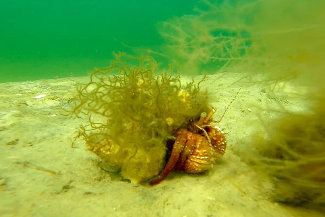 On s’est ancrés près d’une prairie de posidonies pour faire du snorkeling. Le masque demandait un peu d’ajustement (mes cheveux s’y prenaient tout le temps), mais une fois sous l’eau, c’était un autre monde—des crabes bleus qui se faufilaient sur le côté, des éclairs de poissons argentés qui filaient. L’eau n’était pas froide, juste assez pour vous réveiller. Mon neveu a trouvé un coquillage qui semblait tout droit sorti d’un dessin animé ; il l’a exhibé fièrement jusqu’à ce que Brittany lui donne son nom (j’ai déjà oublié, un truc à consonance latine). Elle a ri quand il a essayé de le répéter.
