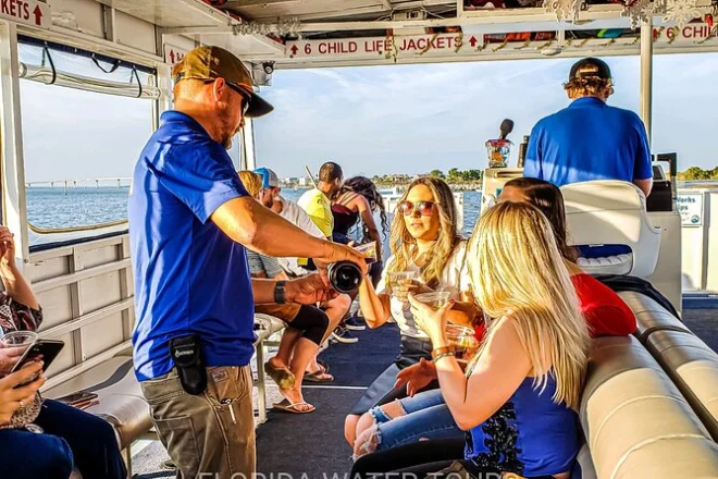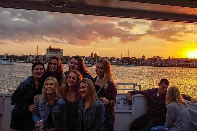 Votre soirée comprend l’embarquement au quai de St. Augustine, un briefing sécurité par l’équipage qualifié, un commentaire local en direct tout au long de la croisière le long du front de mer historique avec des sites comme le Castillo de San Marcos et la Mission Nombre de Dios, ainsi que la dégustation guidée de six vins différents — toutes taxes et frais inclus avant le retour à terre.
