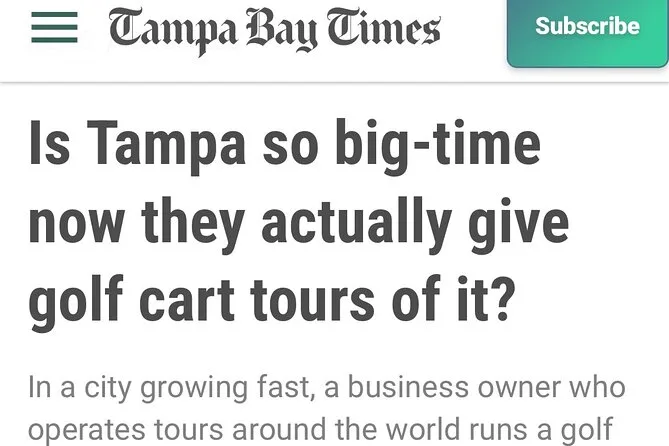 Parcourez les quartiers de Tampa en voiturette électrique légale avec un guide local qui connaît tous les raccourcis et histoires. Arrêts photos et culture à Ybor City, balades le long de Bayshore Boulevard, vues sur les villas au bord de l’eau, et rires spontanés autour d’eau fraîche à volonté. Pas de spectacle, juste Tampa vue par un local.