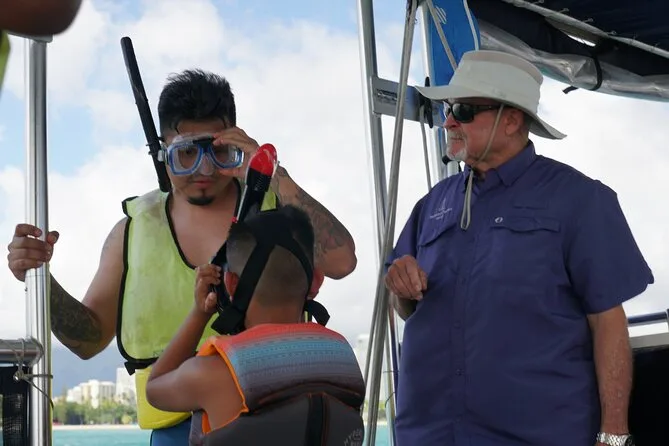 Le bassin de Kewalo était animé quand on s’est retrouvés — des bateaux de pêche rentraient au port, des locaux se saluaient d’un signe de tête décontracté, typique de l’île. Notre groupe était très varié, tous âges et profils confondus (sauf les tout-petits, car les moins de 7 ans ne peuvent pas aller dans l’eau), et Kaleo a pris le temps de s’assurer que tout le monde savait bien utiliser ses palmes avant même de se mouiller. De l’eau en bouteille était dispo, mais honnêtement j’ai oublié d’en boire, trop occupé à guetter les dauphins (pas de chance cette fois). Le catamaran était stable sous nos pieds, ce qui rassurait, surtout avec mon petit trac.
