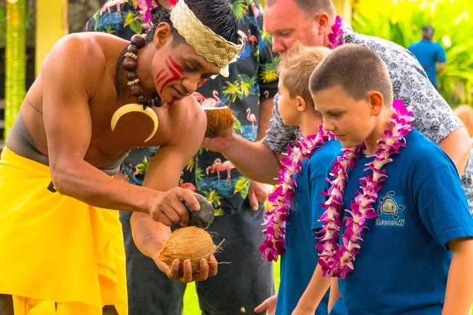Votre journée comprend l’entrée aux jardins et cascades de Waimea Valley avec votre billet luau, un accueil traditionnel avec un collier de fleurs, un Mai Tai ou Aloha Juice (selon votre choix de siège), des démonstrations pratiques comme la cuisine umu et la cérémonie du kava animées par des guides locaux, un buffet complet pour le dîner, ainsi que des danses polynésiennes en direct d’Hawaï à Samoa — avec en point d’orgue une performance inoubliable de danse du couteau enflammé avant le départ.
