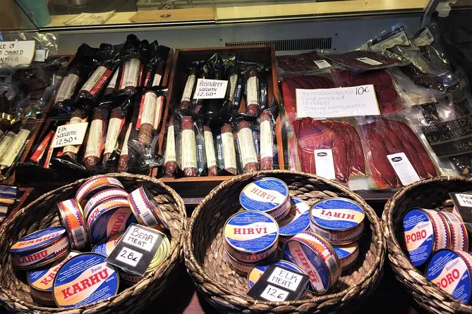La halle du marché était animée mais douce — pas du tout agressive. Des saucisses alignées à côté de bocaux de hareng mariné, l’odeur du poisson fumé mêlée à celle du pain de seigle frais. J’ai goûté du renne fumé à froid (ça peut sembler fou si vous n’êtes pas d’ici), mais c’était étonnamment délicat. Sanni nous a expliqué comment les traditions russes et suédoises se glissent dans la cuisine finlandaise — elle nous a même raconté comment la vodka est devenue incontournable pendant les fêtes. À un moment, j’ai essayé de prononcer « leipäjuusto » (le fromage) et elle a tellement ri qu’elle a failli faire tomber son café.