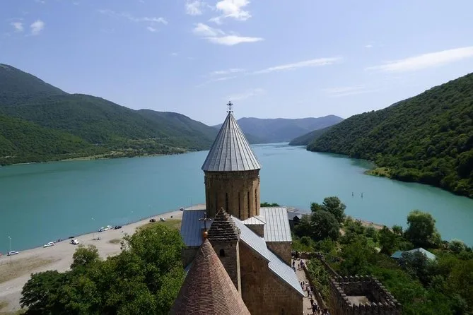 Départ tôt de Tbilissi, nous avons suivi les méandres de la gorge de la rivière Aragvi. L’air était vif, même en été, et on sentait les herbes sauvages quand on s’est arrêtés au bord du réservoir de Zhinvali. Son eau a vraiment cette couleur bleu-vert étrange, presque irréelle. Notre guide, Giorgi, nous a expliqué comment le barrage a changé la vie des villages alentours. Si vous regardez bien, vous verrez encore des pêcheurs lancer leurs lignes depuis l’autre rive.