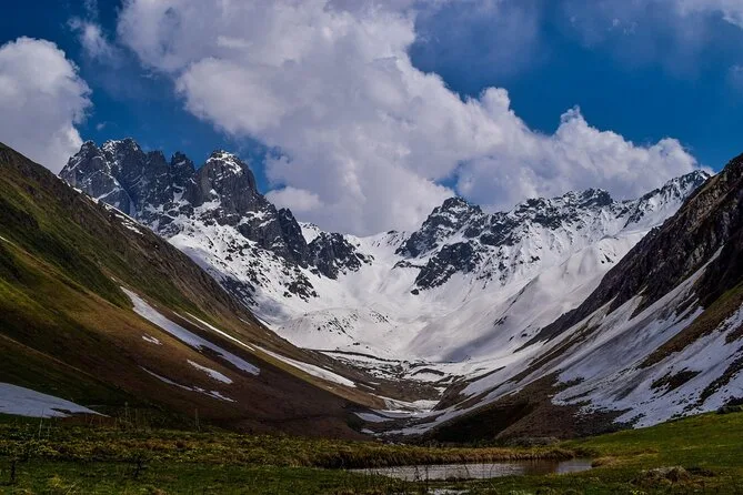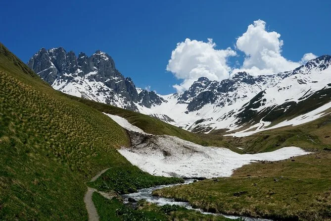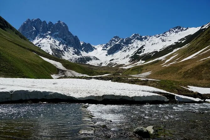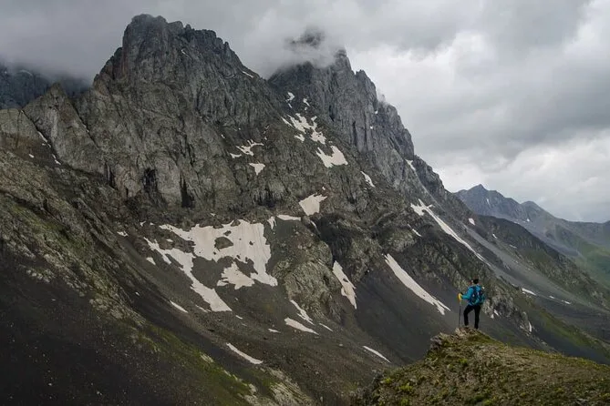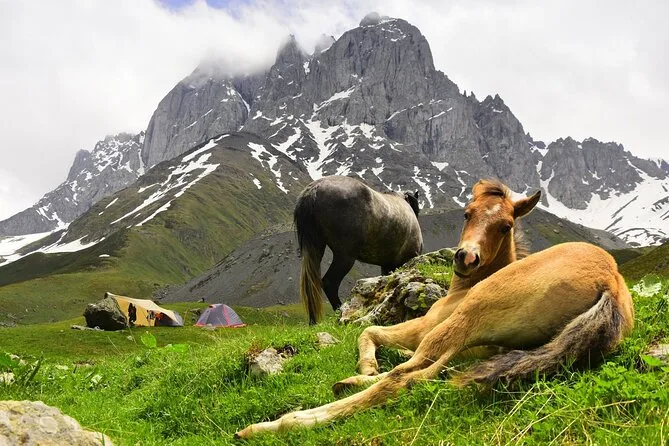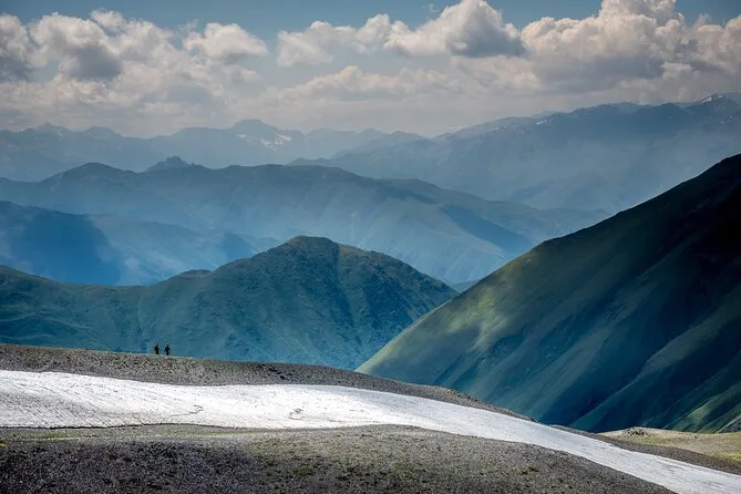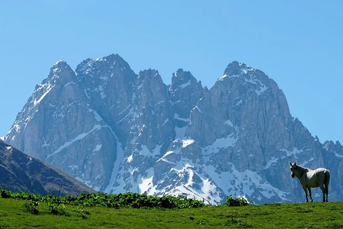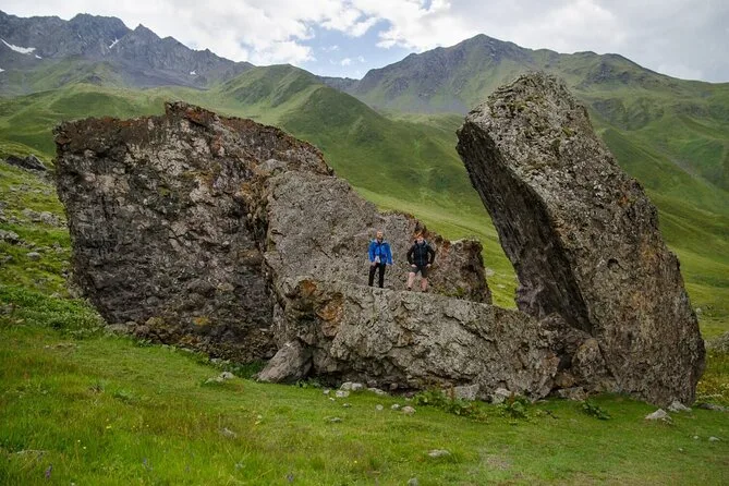 Vous prendrez une navette quotidienne aller-retour de Kazbegi à Juta, avec une courte pause parmi les mystérieuses statues de pierre du village de Sno avant de monter dans l’air pur des montagnes. Horaires fixes, pas de guide, vous êtes libre de randonner ou simplement de profiter des vues du Caucase jusqu’au retour.