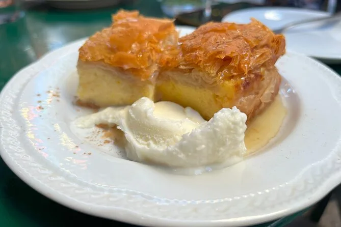 Votre journée comprend des balades guidées dans Plaka et autour de la bibliothèque d’Hadrien, plus de dix dégustations comme les tiropita feuilletées et des fruits de mer frais près du marché central d’Athènes, des dips variés comme le tzatziki, des boulettes de courgettes croustillantes et des assiettes de meze—le tout accompagné de café grec, vin local ou ouzo—et se termine par un dessert sucré classique, le galaktoboureko, avant de rentrer le ventre plein.