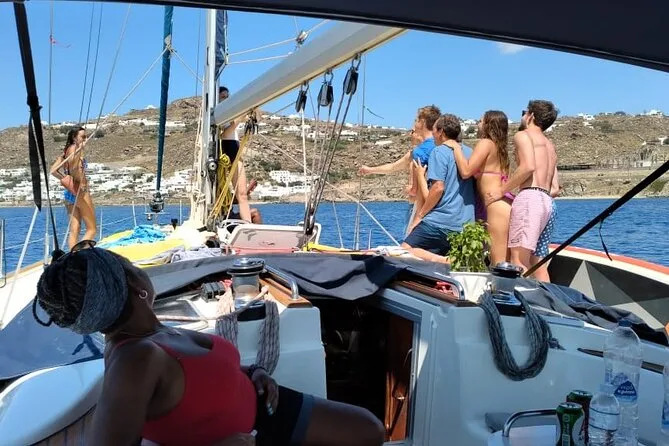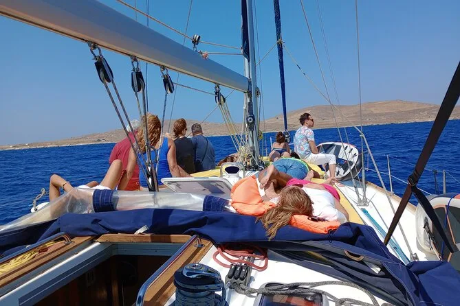 On ne s’est pas arrêtés à Délos (apparemment, seules certaines excursions le font), mais franchement ? Passer lentement devant ces vieilles pierres pendant que Kostas montrait ce qui avait été des temples donnait une sensation assez intime — peut-être parce qu’on est assez loin pour imaginer, mais assez près pour voir les détails. L’eau changeait de couleur toutes les quelques minutes ; parfois elle était comme du verre, d’autres fois presque bleu marine. Quand on a jeté l’ancre près de l’île de Rhenia pour nager, j’ai hésité au début (l’eau est plus froide qu’elle en a l’air), mais une fois dedans… je me souviens encore de la pureté et du calme sous la surface. Le déjeuner était simple : poisson grillé, salade avec des tomates qui avaient le goût du soleil, vin local servi dans des verres dépareillés. Quelqu’un a essayé de m’apprendre à dire « santé » en grec — j’ai clairement raté mon coup.
