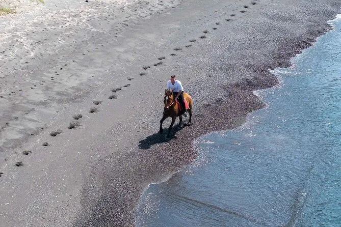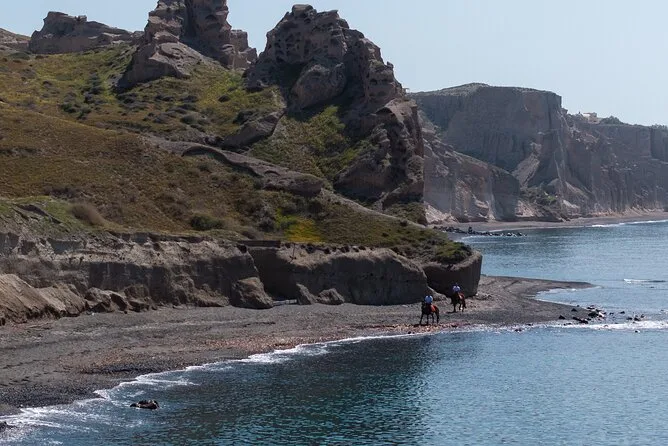 Le sentier vers la caldeira semblait presque irréel — falaises blanches d’un côté, sable noir à perte de vue de l’autre. Nous nous sommes arrêtés à un point de vue où l’on voyait le volcan en face ; Yannis nous a tendu des bouteilles d’eau et a montré comment la lumière illuminait les rochers (« C’est pour ça que les artistes viennent peindre ici », a-t-il expliqué). Le silence régnait, à part le bruit lointain des vagues et un rire derrière moi, parce que je n’arrivais pas à faire tenir mon cheval tranquille pour une photo. Honnêtement, ça ne m’a pas dérangé — parfois, il vaut mieux juste profiter du moment.