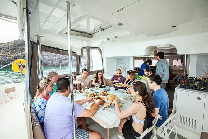 Votre journée comprend la navette aller-retour autour de Santorin, des serviettes fraîches pour les baignades sur des plages accessibles uniquement en bateau, tout le matériel de snorkeling nécessaire, vin ou bière locale à volonté ainsi que des boissons non alcoolisées pendant toute la croisière, et un déjeuner barbecue préparé à bord avant de rentrer en fin d’après-midi ou après le coucher du soleil selon votre choix.