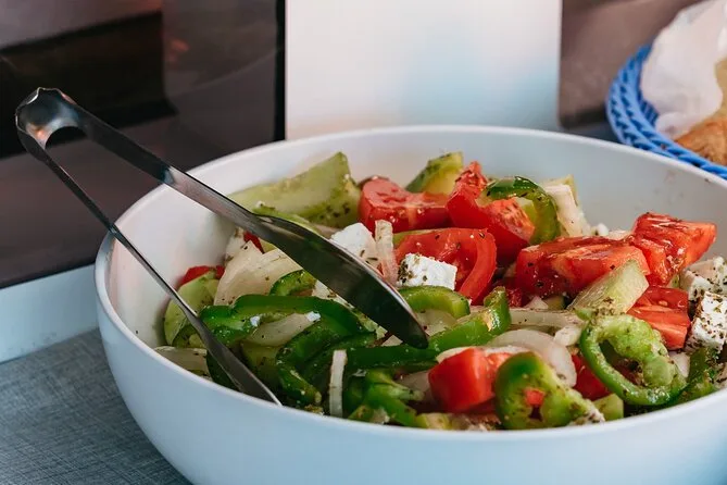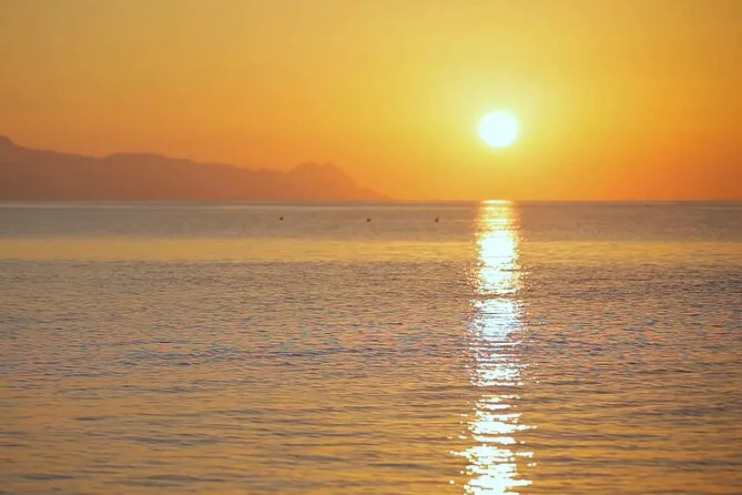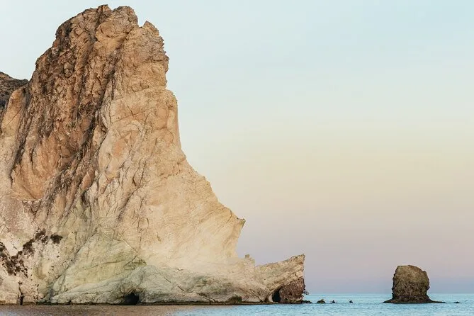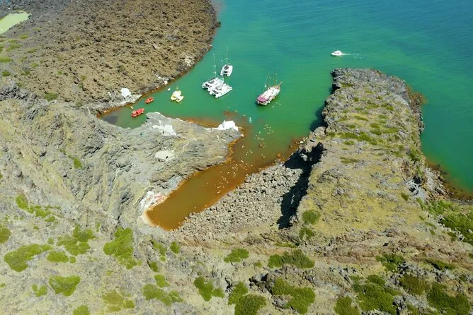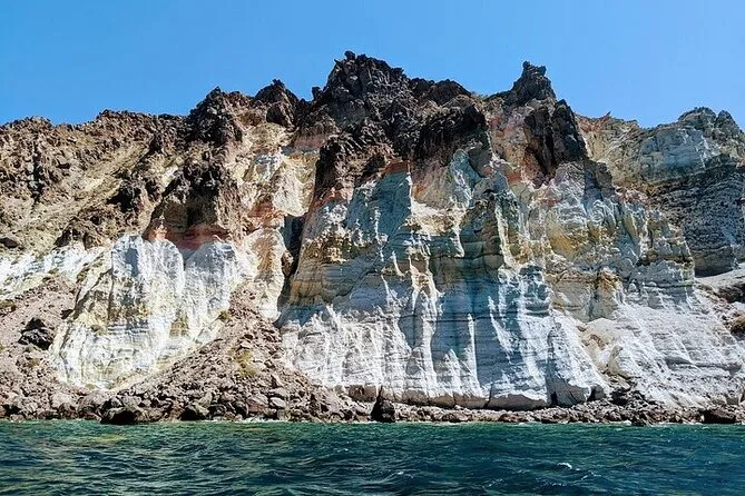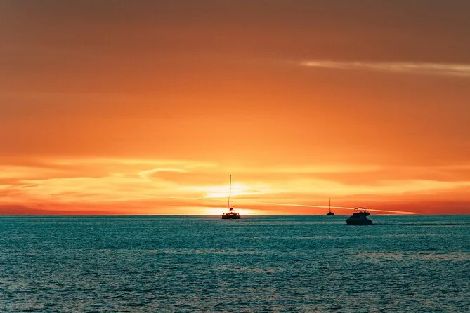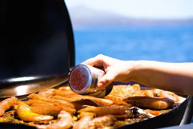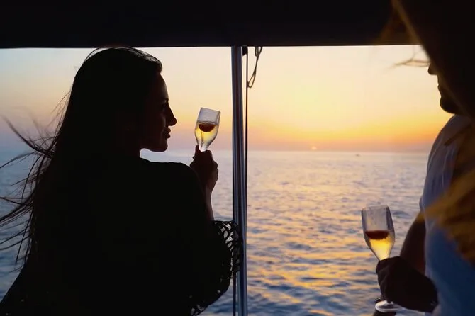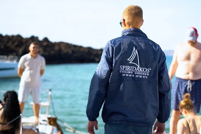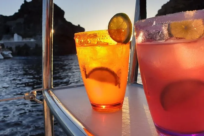 Votre journée comprend le transfert hôtel aller-retour en minivan, tous les frais et taxes, les serviettes, le matériel de snorkeling, un bar ouvert avec boissons sans alcool, deux cocktails par personne, vin blanc et bière, un repas BBQ frais avec crevettes, filet de poulet, saucisse de bœuf, pâtes à la sauce tomate, salade grecque, tzatziki, feuilles de vigne farcies, pain et dessert, avant le retour au coucher du soleil sur Santorin.