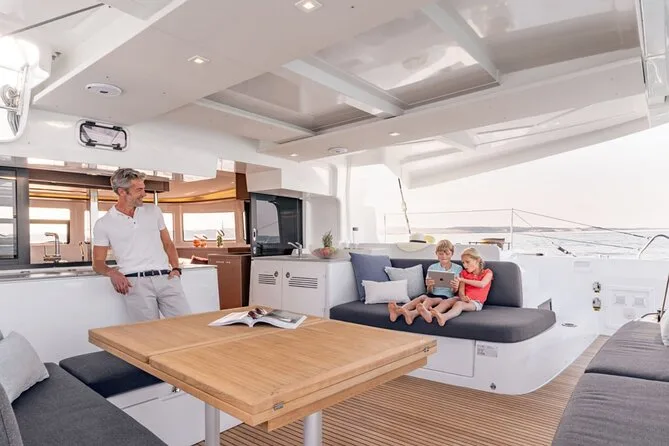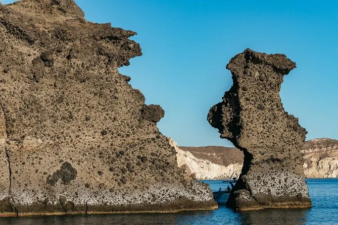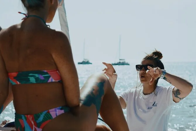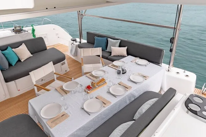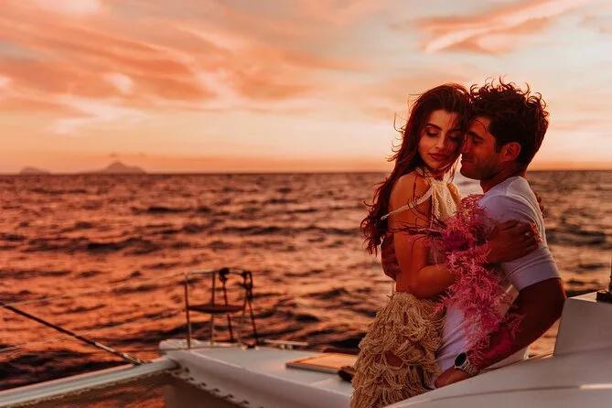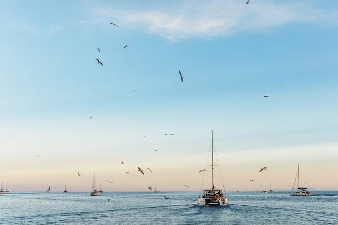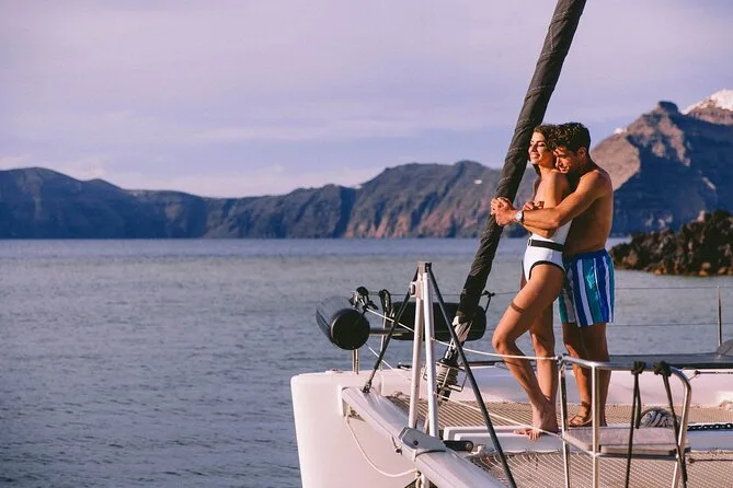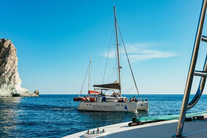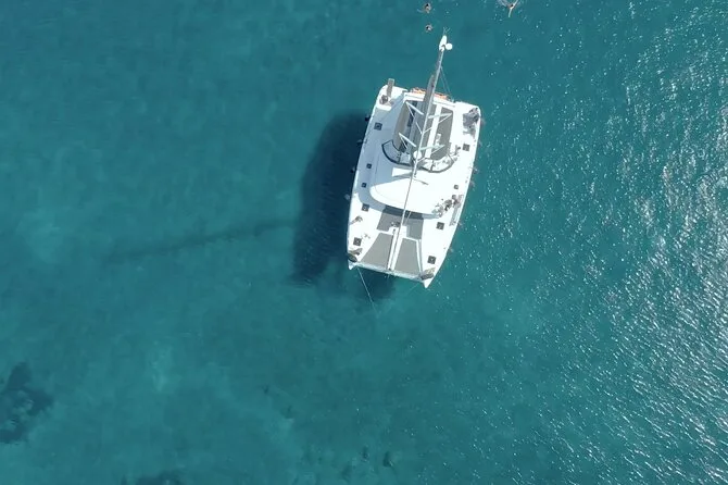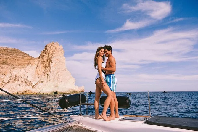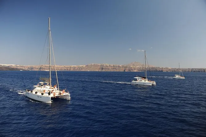 Embarquez pour une croisière en petit groupe le long de la côte de Santorin en catamaran, avec arrêts aux plages Rouge et Blanche et aux sources volcaniques. Nagez ou faites du snorkeling directement depuis le bateau, puis partagez un déjeuner BBQ accompagné de vin local pendant que les falaises défilent. Transfert hôtel inclus pour une journée sans souci — il ne vous reste plus qu’à prendre votre maillot et vous laisser porter.