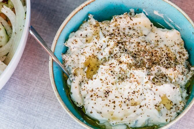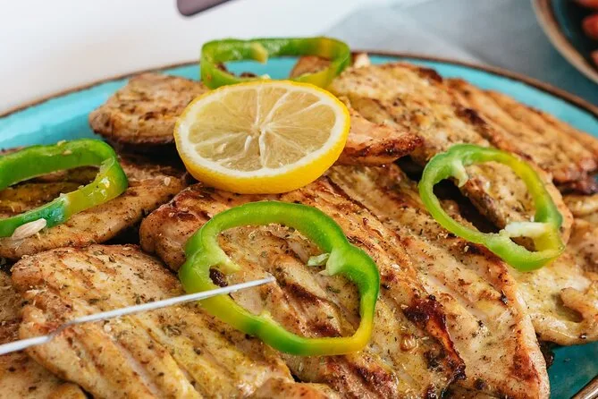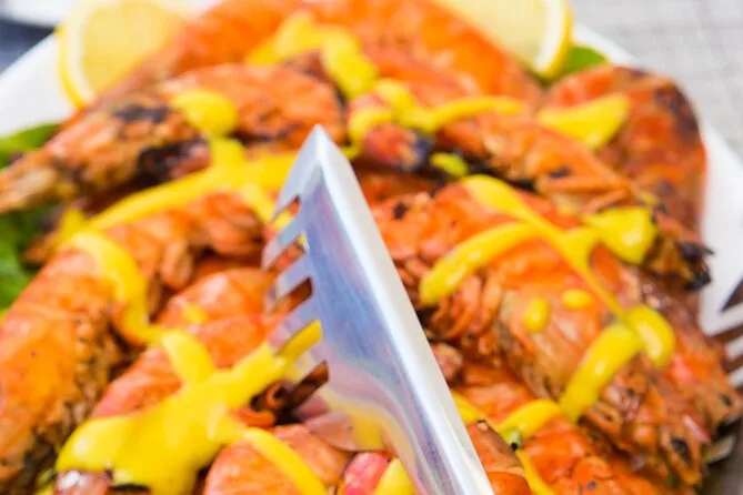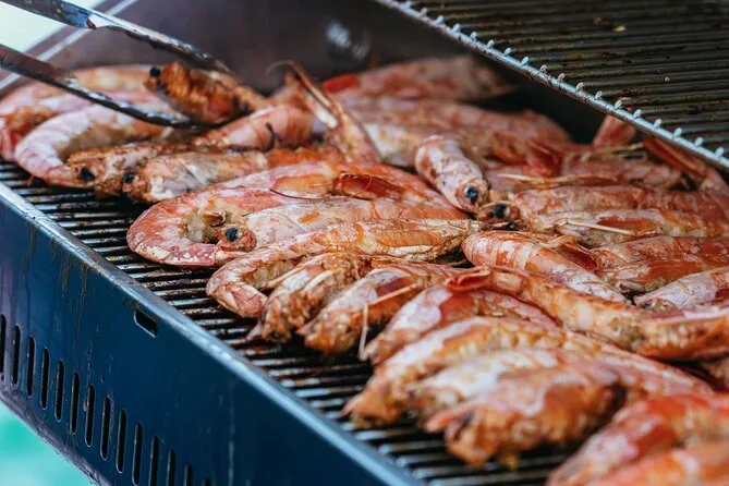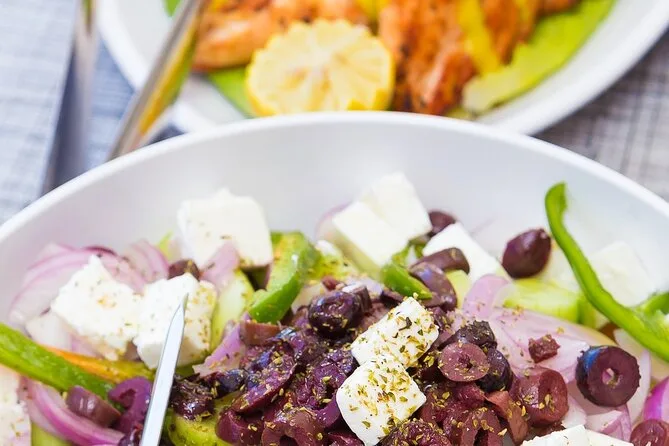 Au menu : crevettes BBQ, filet de poulet, saucisse de bœuf, pâtes à la sauce tomate, salade grecque, tzatziki, feuilles de vigne farcies, pain et dessert.