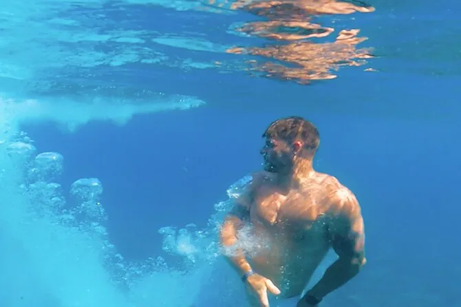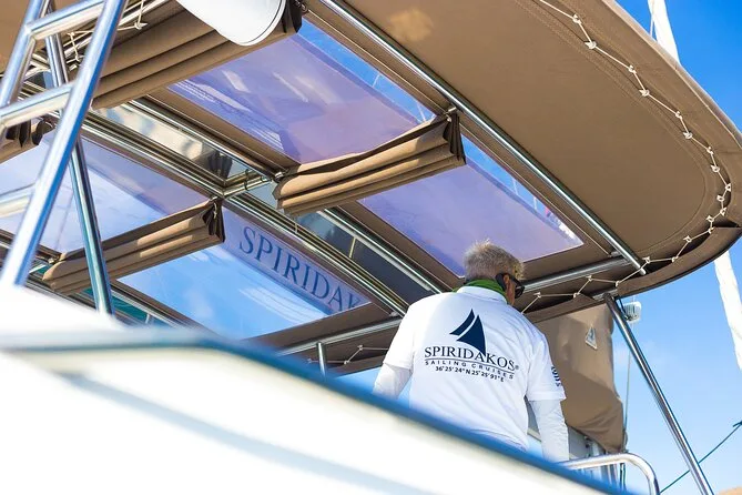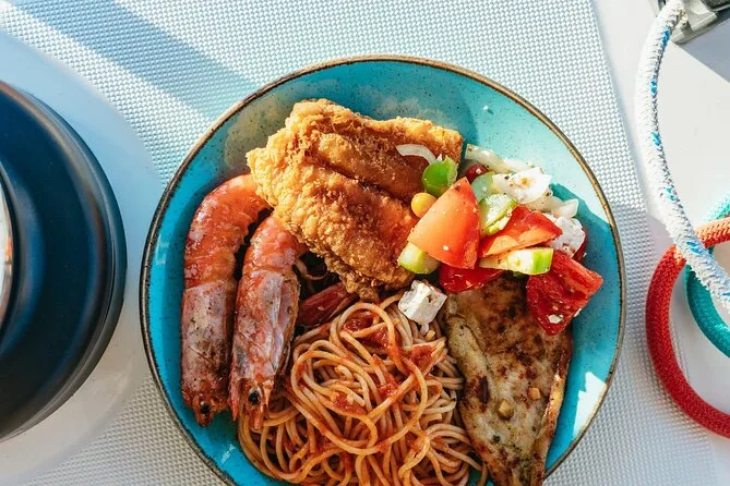 Le bateau a ralenti près des Indian Rocks puis on a jeté l’ancre dans une crique tranquille pour le déjeuner. L’équipage a servi des assiettes de crevettes, brochettes de poulet, pâtes à la sauce tomate — et un tzatziki bien relevé à l’ail, parfait pour éloigner les vampires pendant des jours. Le vin blanc local coulait à flot ; je crois que j’ai dépassé les deux verres sans honte. Une musique douce jouait (une vieille chanson pop grecque) pendant que certains faisaient du snorkeling ou flottaient simplement. L’ambiance était détendue — personne ne se pressait ni ne parlait trop fort.