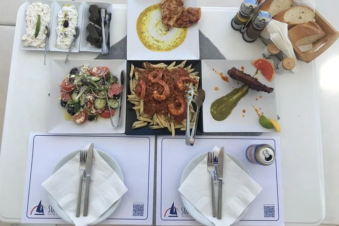 Un BBQ grec est préparé à bord, accompagné de boissons comme du vin local, de la bière et des softs.