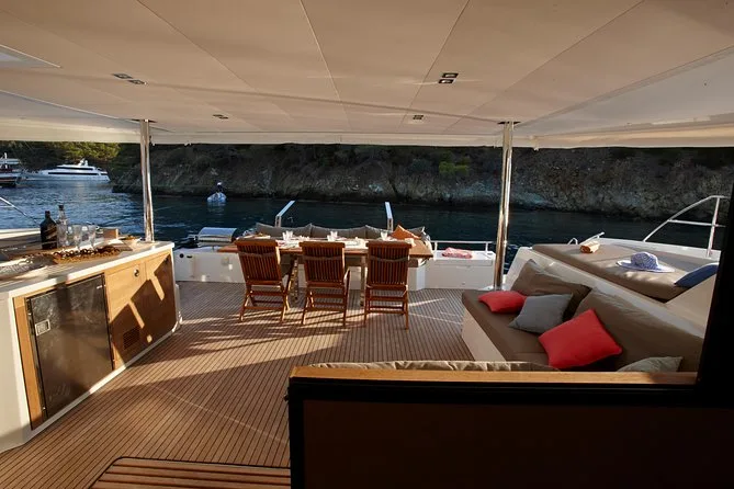 Embarquez pour une croisière en catamaran de luxe dans la caldeira de Santorin avec un petit groupe, arrêts baignade aux plages Rouge et Blanche, et détente aux sources volcaniques. Savourez un BBQ grec avec boissons sur le pont pendant que l’équipage partage histoires et musique. Rires, air marin et souvenirs inoubliables garantis.