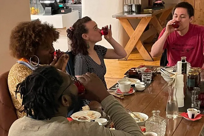 Votre expérience comprend la dégustation guidée de trois huiles d’olive extra vierges bio et de deux miels (fleurs et pin), accompagnée de tomates cerises, feta, charcuterie grecque traditionnelle, crackers ou gressins, et un verre de raki — le tout sous terre avec votre guide local, en petit groupe sous la place principale de Fira.