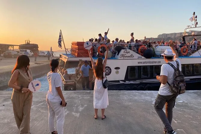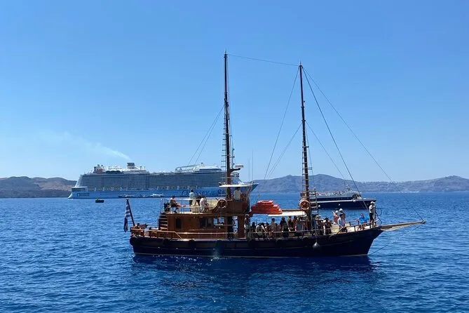 Vous descendez directement de votre bateau de croisière pour traverser la caldeira de Santorin en bateau — sans files ni ânes — puis vous explorez les villages aux dômes bleus comme Oia et Megalochori avec un guide local. Vous aurez aussi le temps de vous détendre sur la plage de sable noir de Perivolos avant un retour facile en bateau. Santorin sans stress, juste des moments vrais et l’air salé.