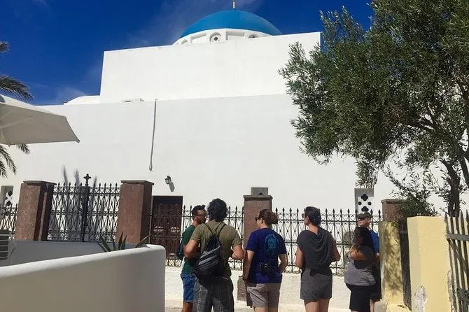 La montée jusqu’au Monastère du Profitis Ilias était plus raide que prévu — j’ai senti mes oreilles se boucher en arrivant en haut. L’air là-haut est différent, presque vif, et on peut voir les deux côtés de Santorin en même temps. Même si vous n’êtes pas fan de photos, c’est difficile de ne pas sortir son téléphone. Giorgos nous a raconté qu’il y a encore des moines qui vivent ici ; apparemment, ils fabriquent leur propre miel (il nous a laissé en goûter — doux et floral). Je n’arrêtais pas de penser au calme absolu, seulement troublé par le vent et les cloches lointaines en contrebas.